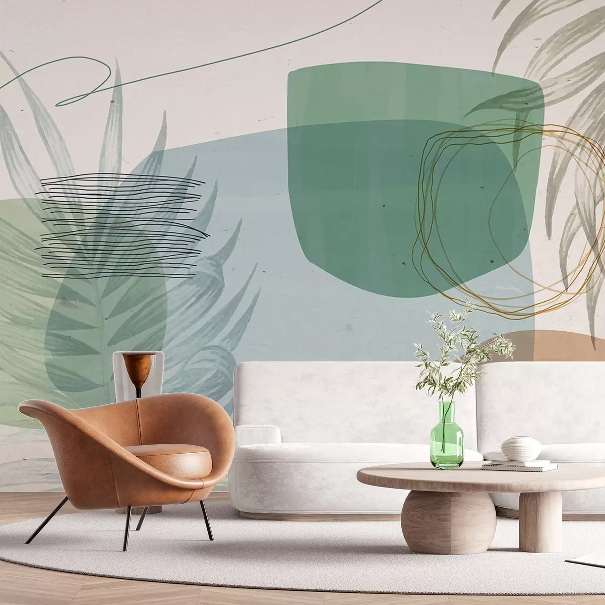 Papier peint Composition abstraite texturée avec des formes organiques et des feuilles tropicales, dans des couleurs pastel atténuées N° w08335