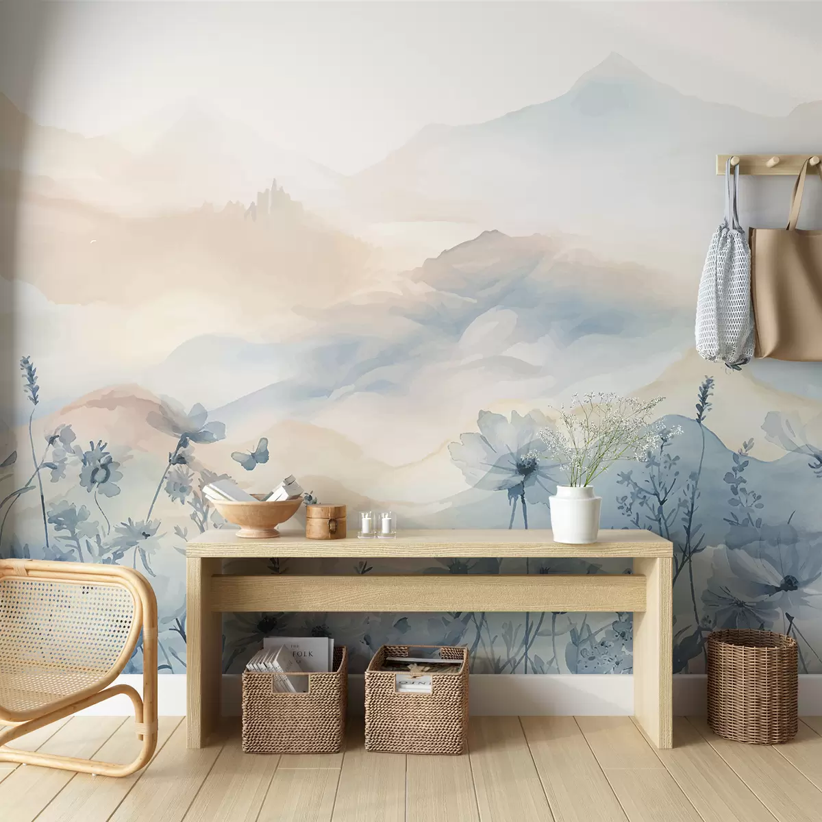 Papier peint Un paysage serein avec une chaîne de montagnes brumeuses en arrière-plan, entouré d'un champ de fleurs bleues délicates N° w08339