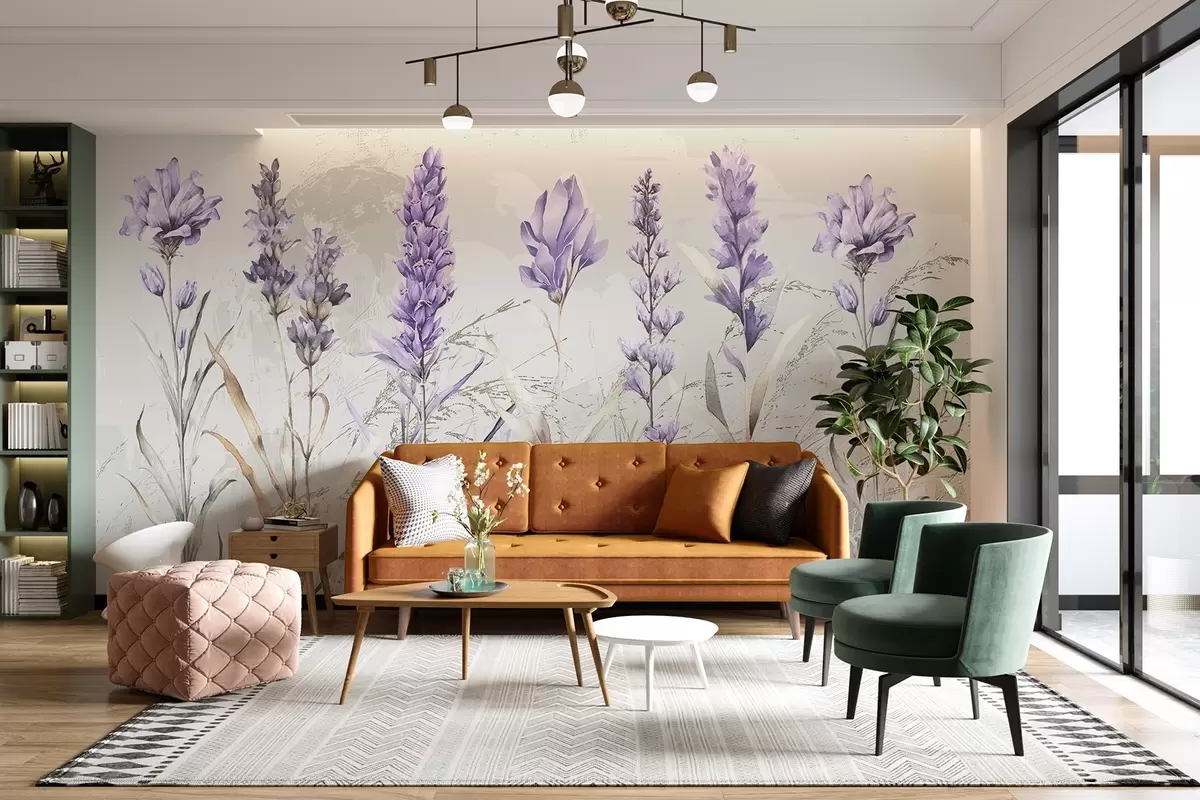 Papier peint Un champ de fleurs violettes lavande en aquarelle sur un fond beige texturé, flou et doux N° w08346