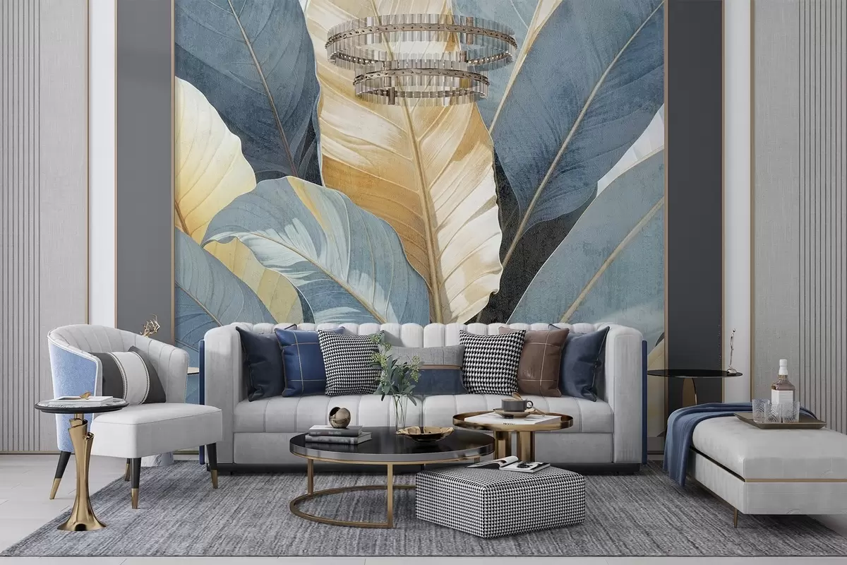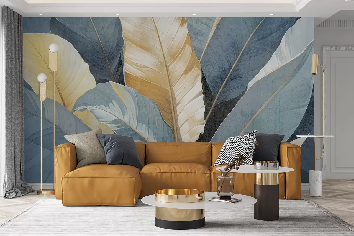 Papier peint Gros plan sur de grandes feuilles tropicales décoratives, luxuriantes et texturées, dans les tons bleu, vert et jaune N° w08373