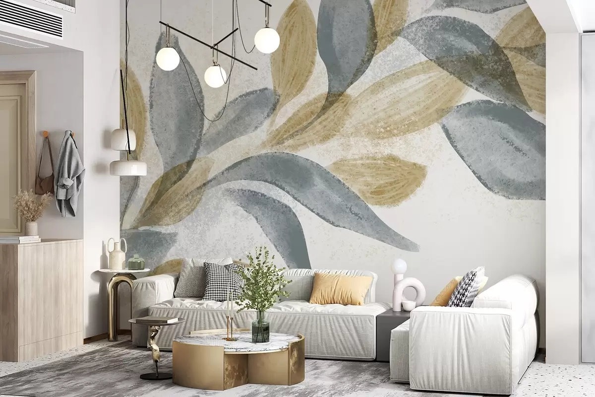 Papier peint Feuilles pastel texturées de couleur beige et bleue avec des bords doux et des éclaboussures sur un fond clair N° w08374