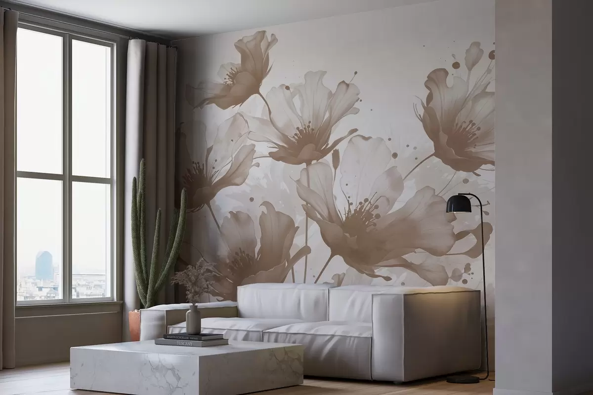 Papier peint Fleurs brunes délicates avec des pétales doux et flous et des éclaboussures d'aquarelle sur un fond clair N° w08376v1