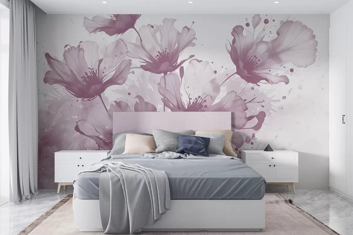 Papier peint Fleurs roses délicates avec des pétales doux et flous et des éclaboussures d'aquarelle sur un fond clair N° w08376v2