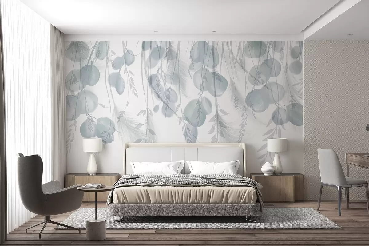 Papier peint De délicates feuilles d'eucalyptus grises et vertes pastel tombent, créant une atmosphère sereine et apaisante N° w08380