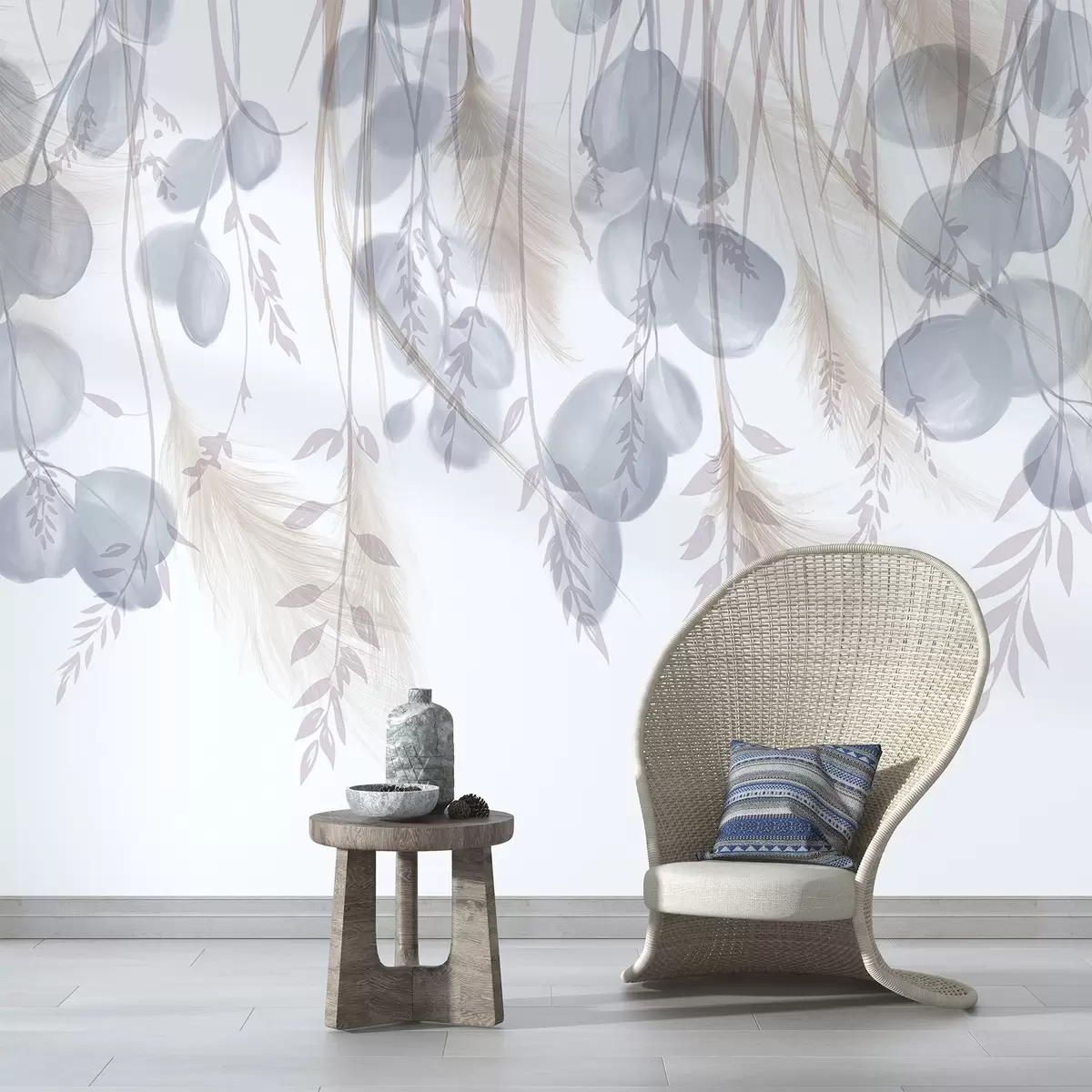 Papier peint De délicates feuilles d'eucalyptus bleues et beige pastel tombent, créant une atmosphère sereine et apaisante N° w08380v1