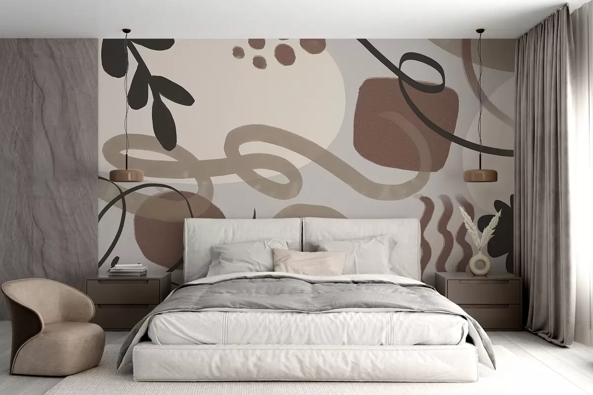 Papier peint Imprimé moderne minimaliste texturé abstrait avec des formes dans des tons terreux de marron, beige et noir N° w08384