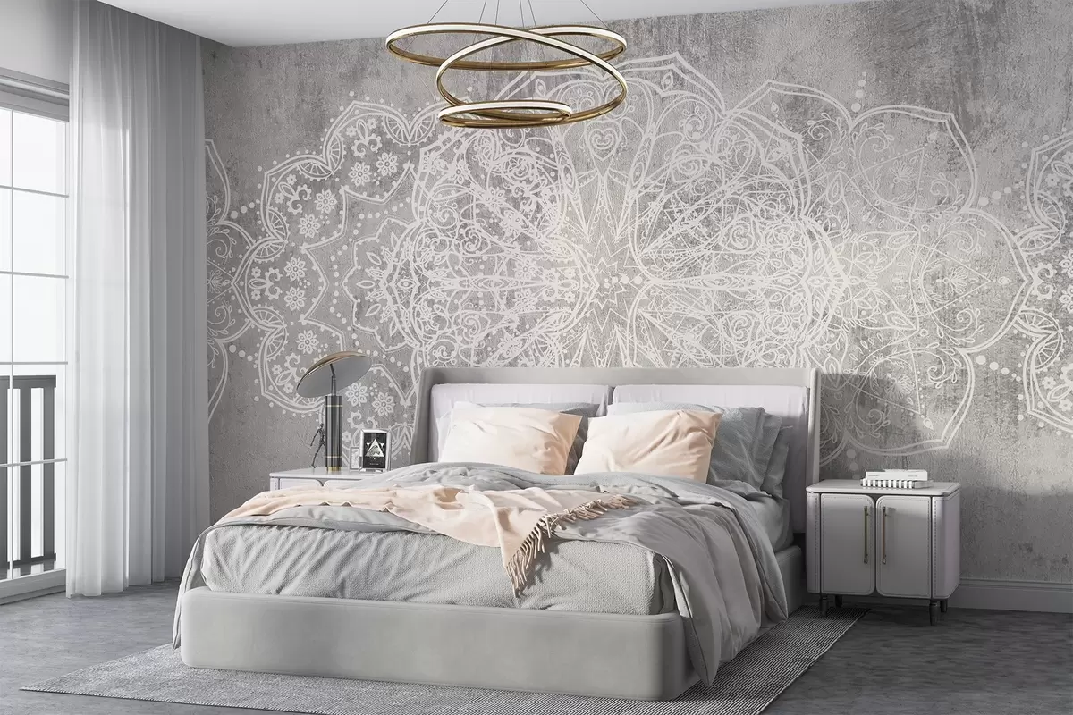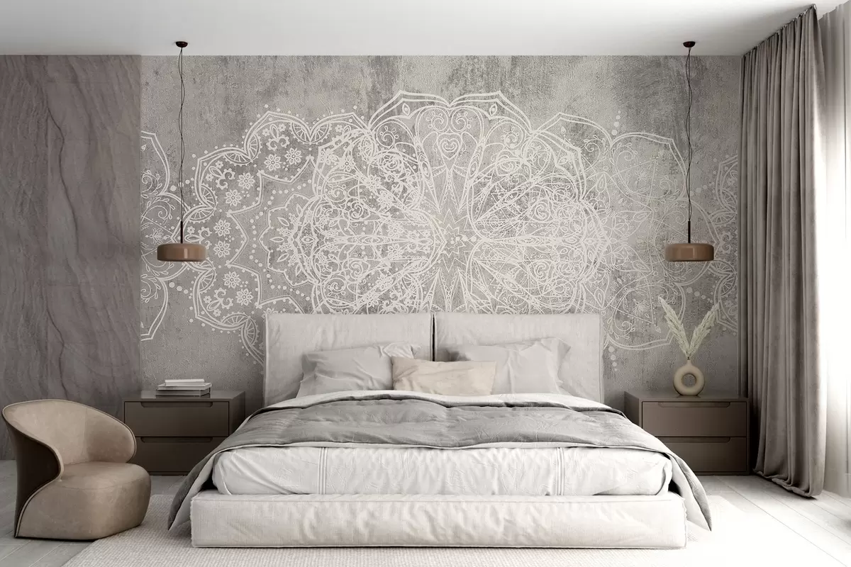 Papier peint Un motif de mandala en dentelle blanche, détaillé et complexe, sur un fond de mur gris loft texturé N° w08387