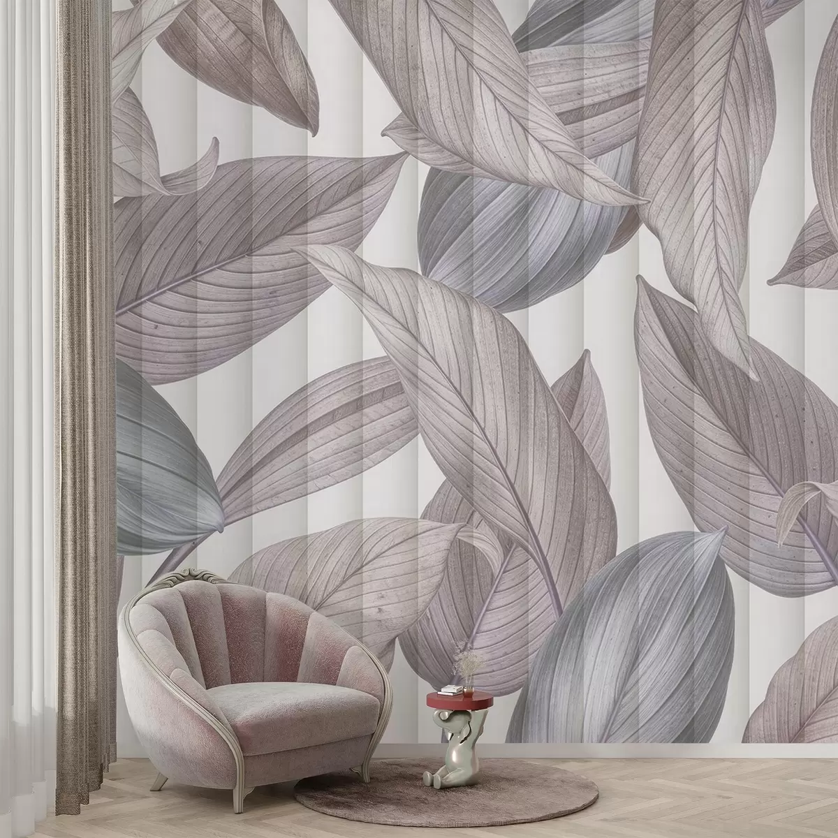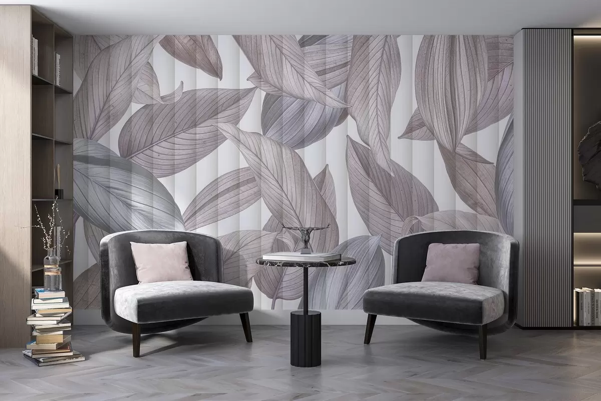 Papier peint Feuilles abstraites détaillées dans des tons de bleu, de gris et de rose pastel sur un fond clair N° w08388v1