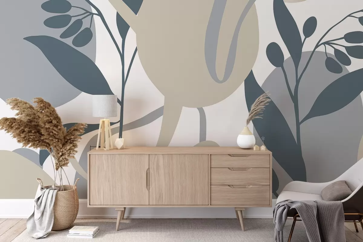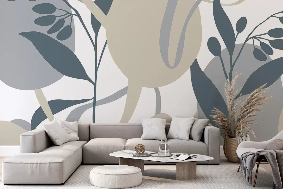 Papier peint Imprimé floral abstrait minimaliste avec des formes beiges et grises sur fond blanc N° w08400