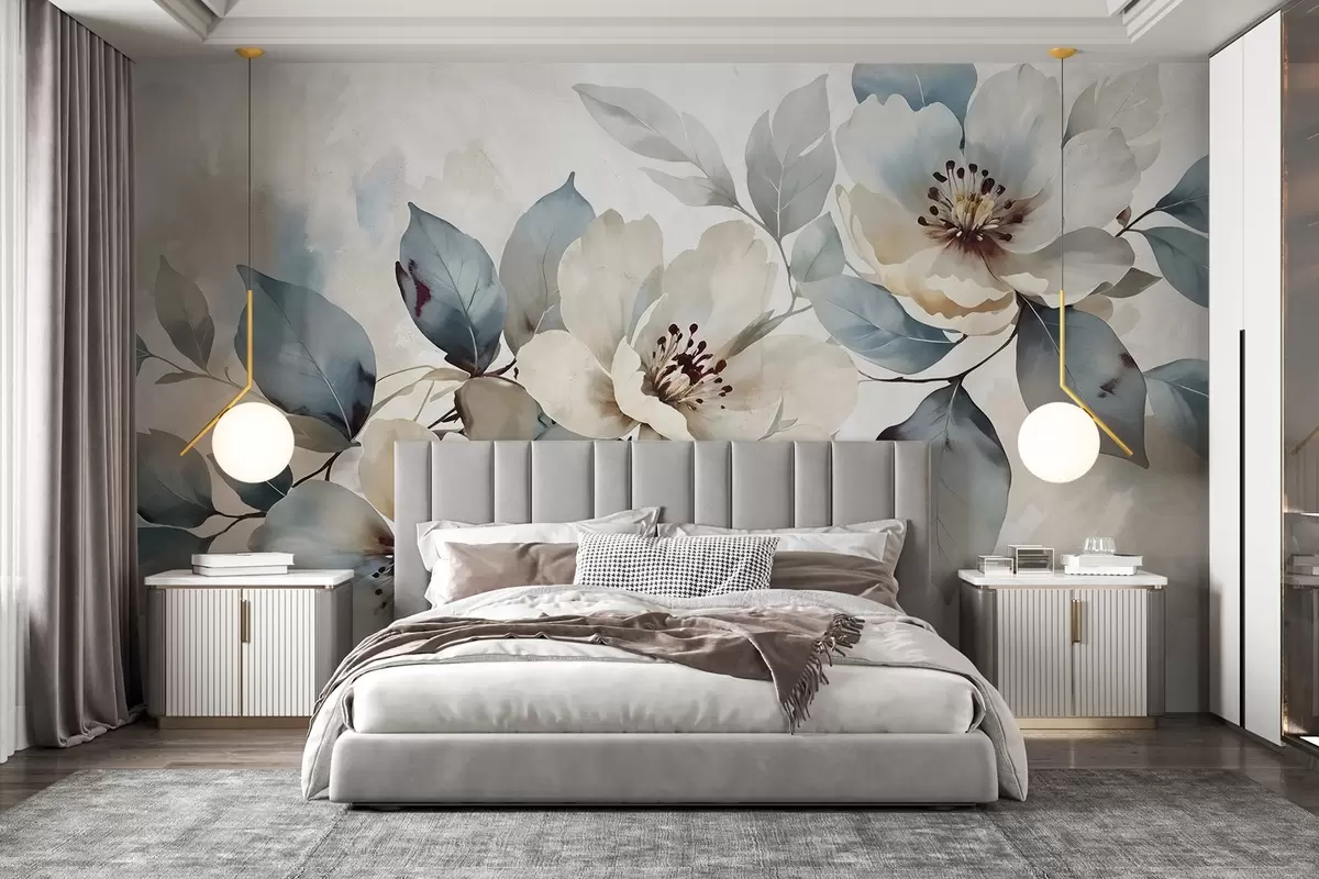 Papier peint Arrangement floral blanc et bleu délicatement texturé à l'aquarelle, avec des pétales et des centres doux N° w08401