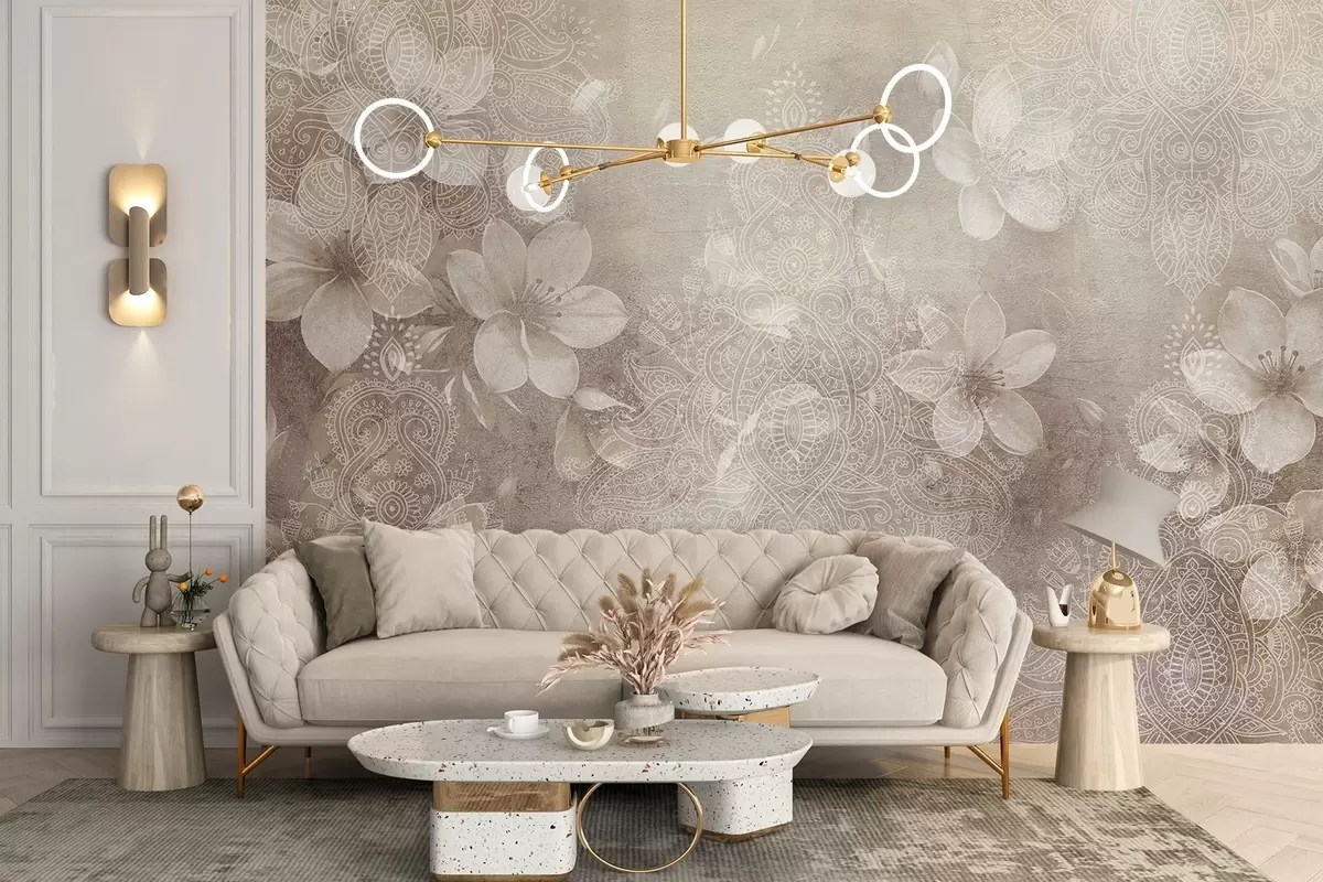 Papier peint Dessin de fleurs blanches délicates sur un fond flou de dentelle beige texturée N° w08405v1