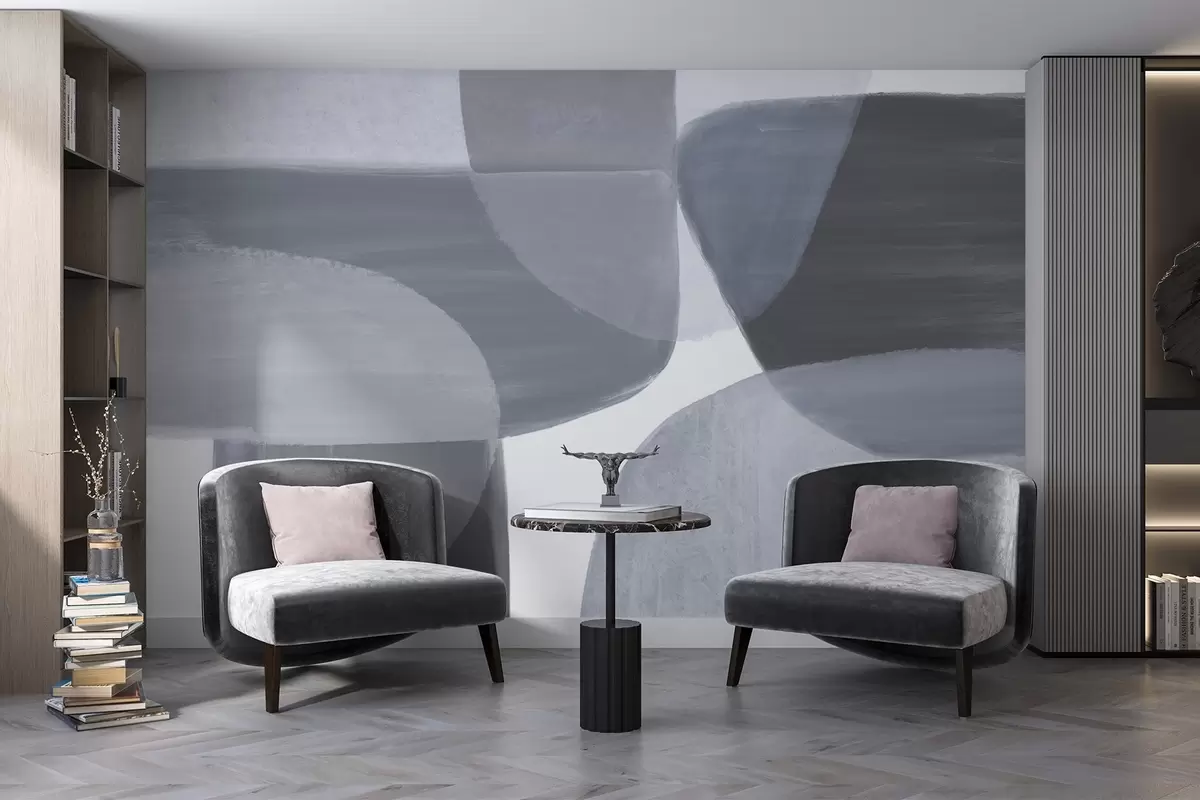 Papier peint Un imprimé abstrait monochrome avec des formes minimalistes qui se chevauchent dans des tons de gris et de bleu. N° w08410