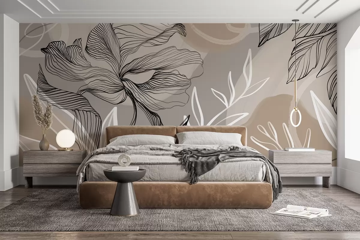 Papier peint Impression florale élégante avec de grandes fleurs et feuilles abstraites dans les tons gris et beige sur un fond clair N° w08413
