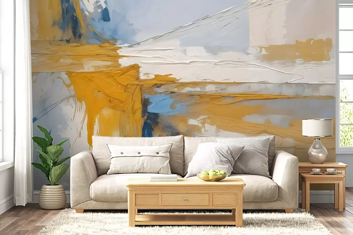 Papier peint Composition d'art abstrait minimaliste avec des coups de pinceau audacieux de peinture jaune, bleue et blanche N° w08414