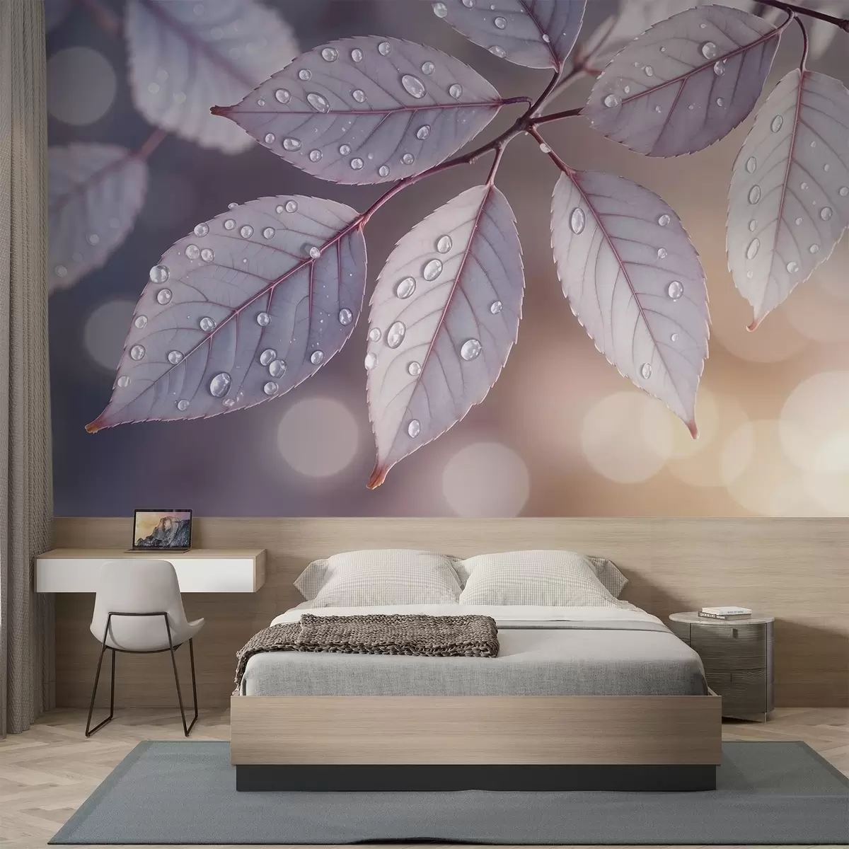 Papier peint Feuilles violettes délicates avec des gouttes d'eau, arrière-plan à mise au point douce N° w08419