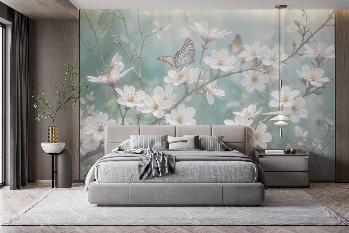 Papier peint Papillon blanc sur une branche avec de délicates fleurs de cerisier blanches au premier plan sur un arrière-plan flou N° w08421