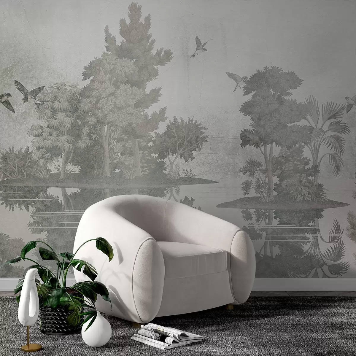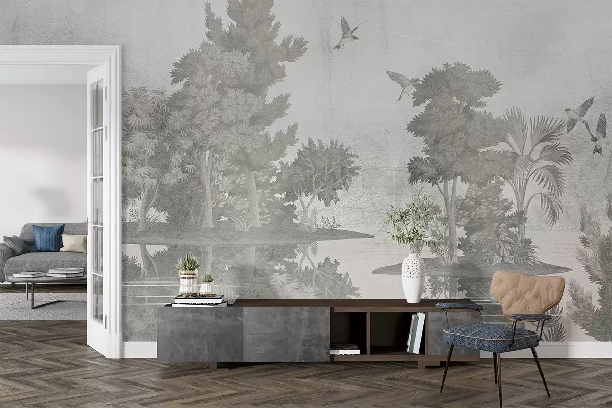 Papier peint Impression d'un paysage forestier avec un lac entouré de pins et d'autres feuillages sur un fond vert texturé N° w08426v1