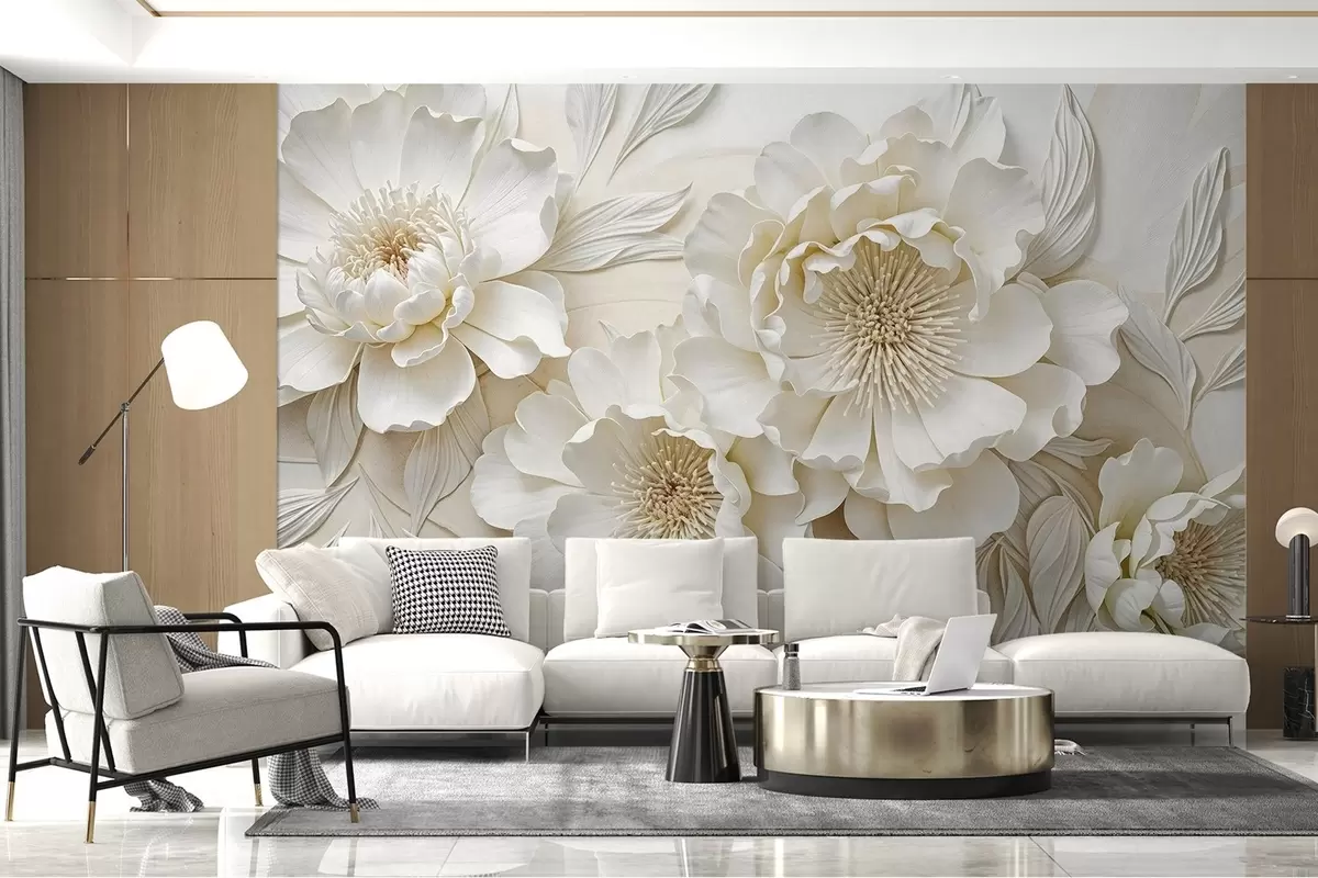 Papier peint Élégantes et volumineuses fleurs de pivoine imitant le blanc, avec des pétales doux et des centres jaune pastel, sur un fond clair N° w08431