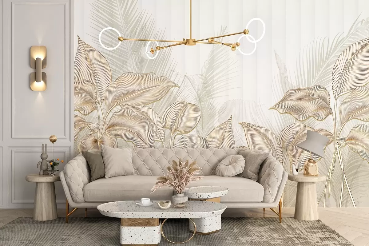 Papier peint Élégantes feuilles de palmier blanches et beiges sur un fond clair et texturé N° w08434