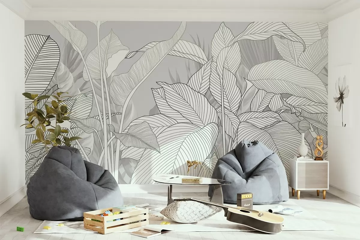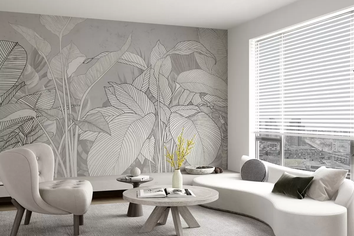 Papier peint Illustration monochrome présentant de grandes feuilles stylisées et du feuillage avec des motifs de lignes et des textures complexes N° w08436