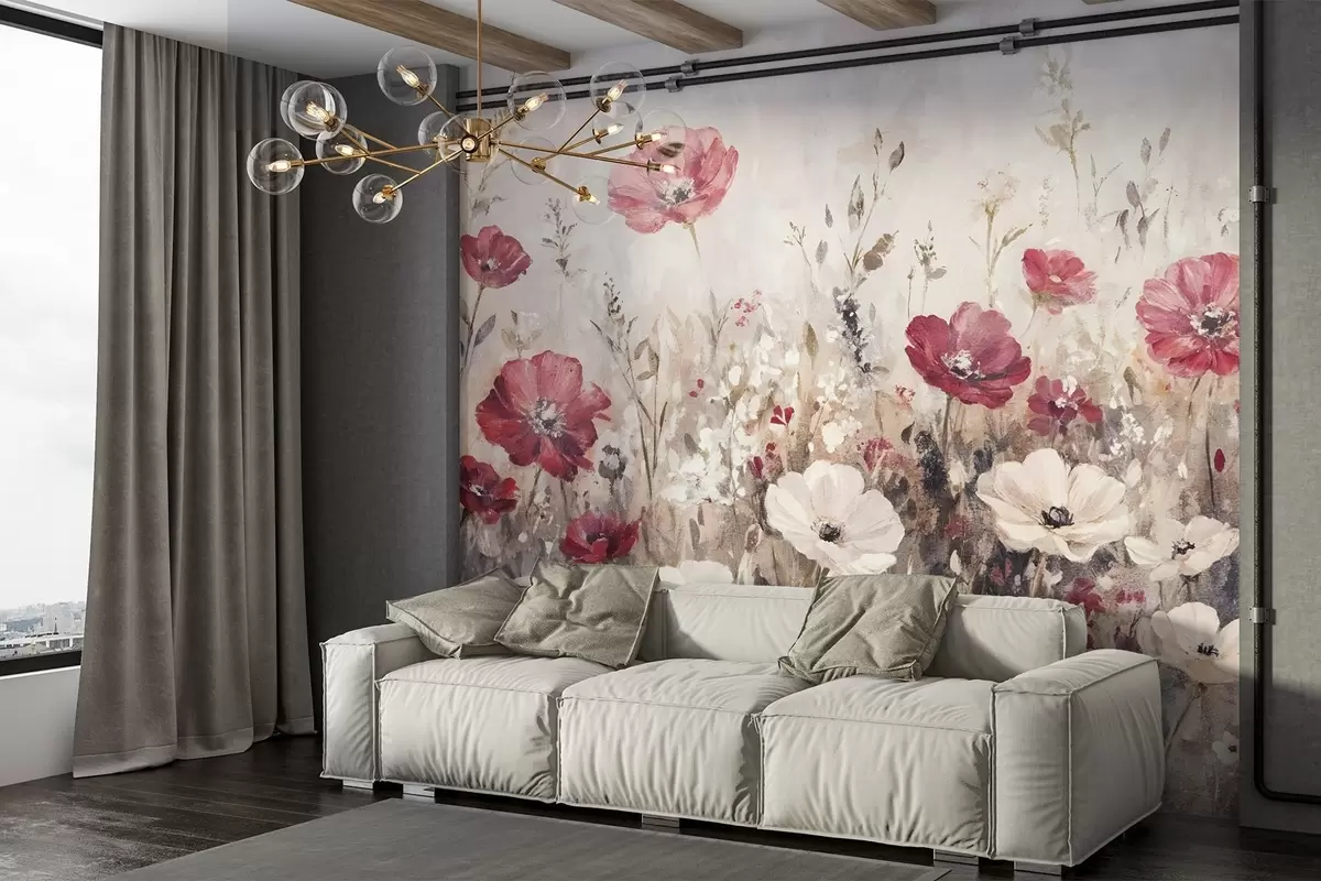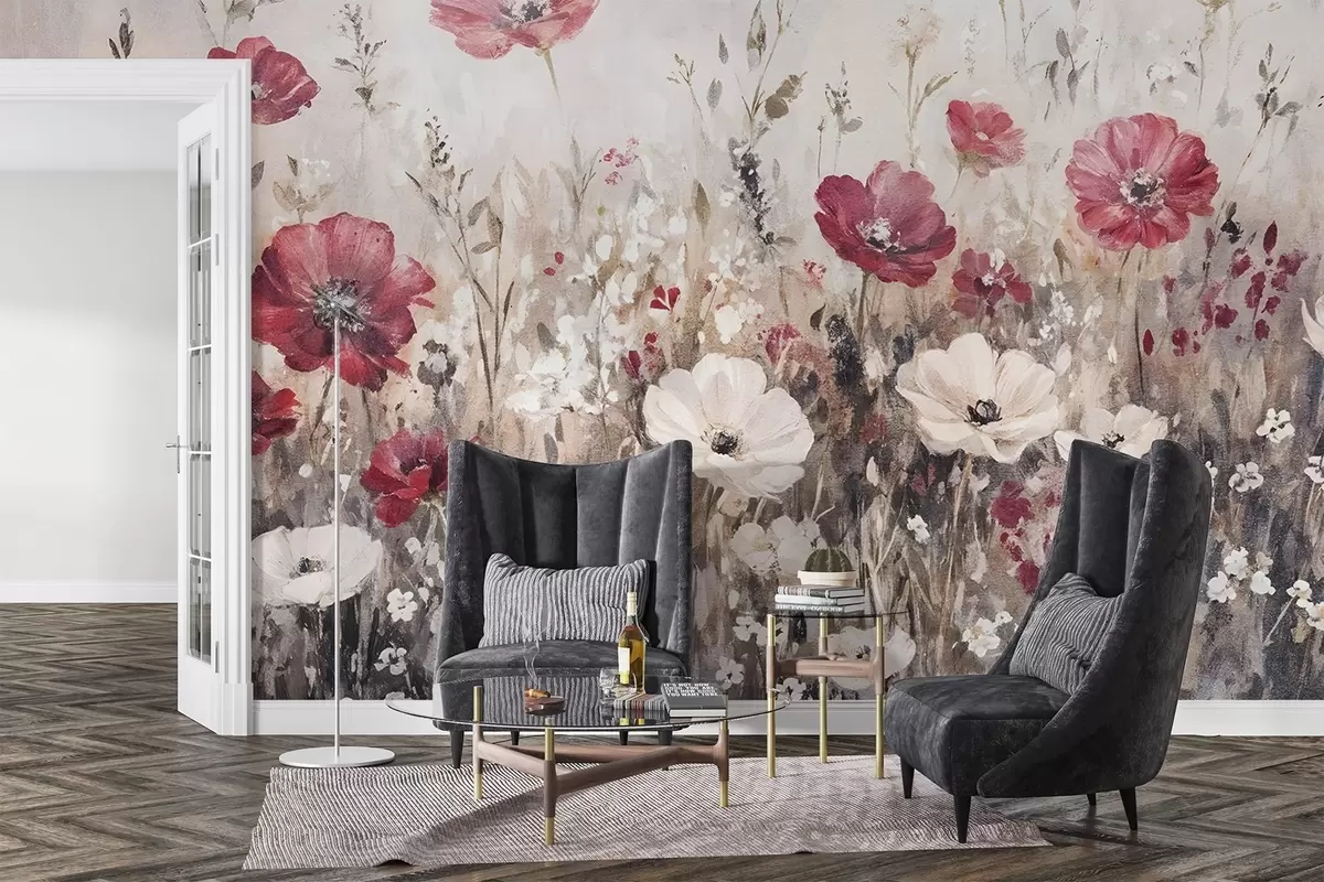 Papier peint Un champ de fleurs rouges et blanches vibrantes sur un fond doux et brumeux dans le style de la peinture à l'huile N° w08438