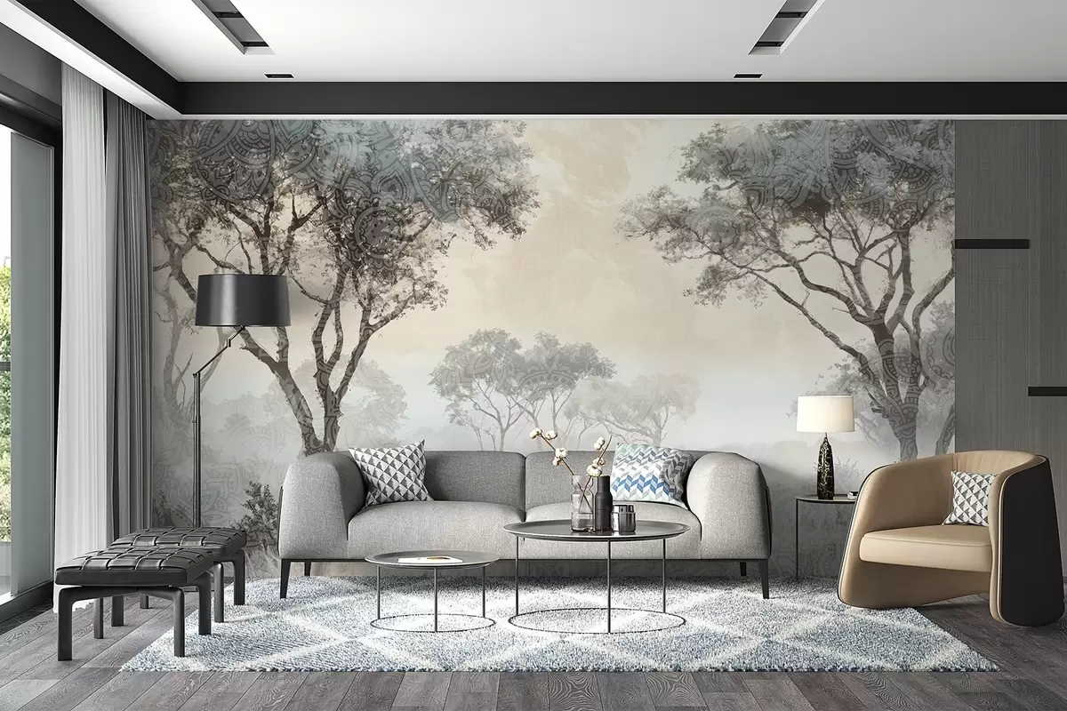 Papier peint Paysage brumeux et serein avec des silhouettes d'arbres au premier plan et un brouillard doux dans les tons gris et beige N° w08442v1
