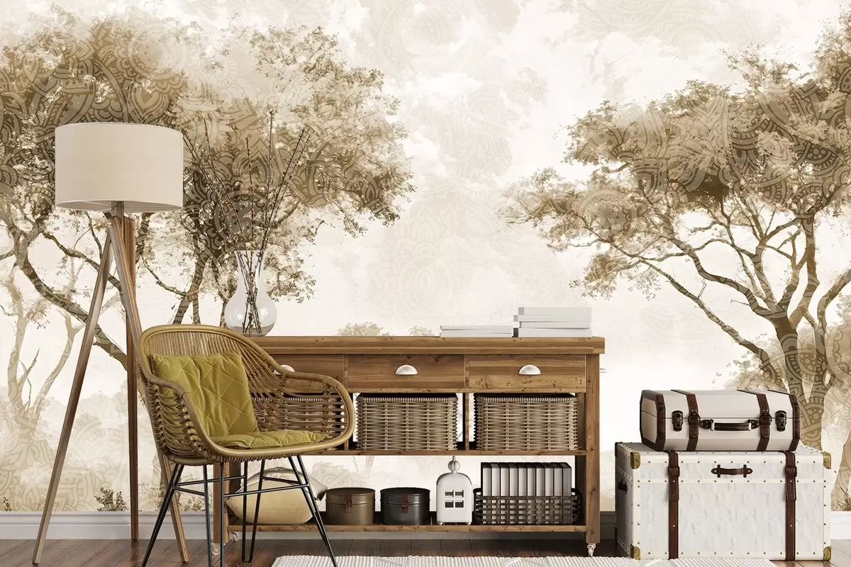 Papier peint Un paysage brumeux et serein avec des silhouettes d'arbres au premier plan et un brouillard doux dans les tons bruns et beiges N° w08442v2