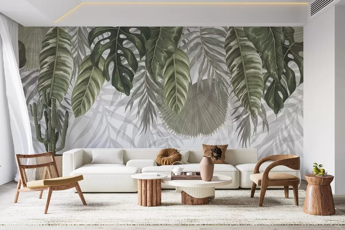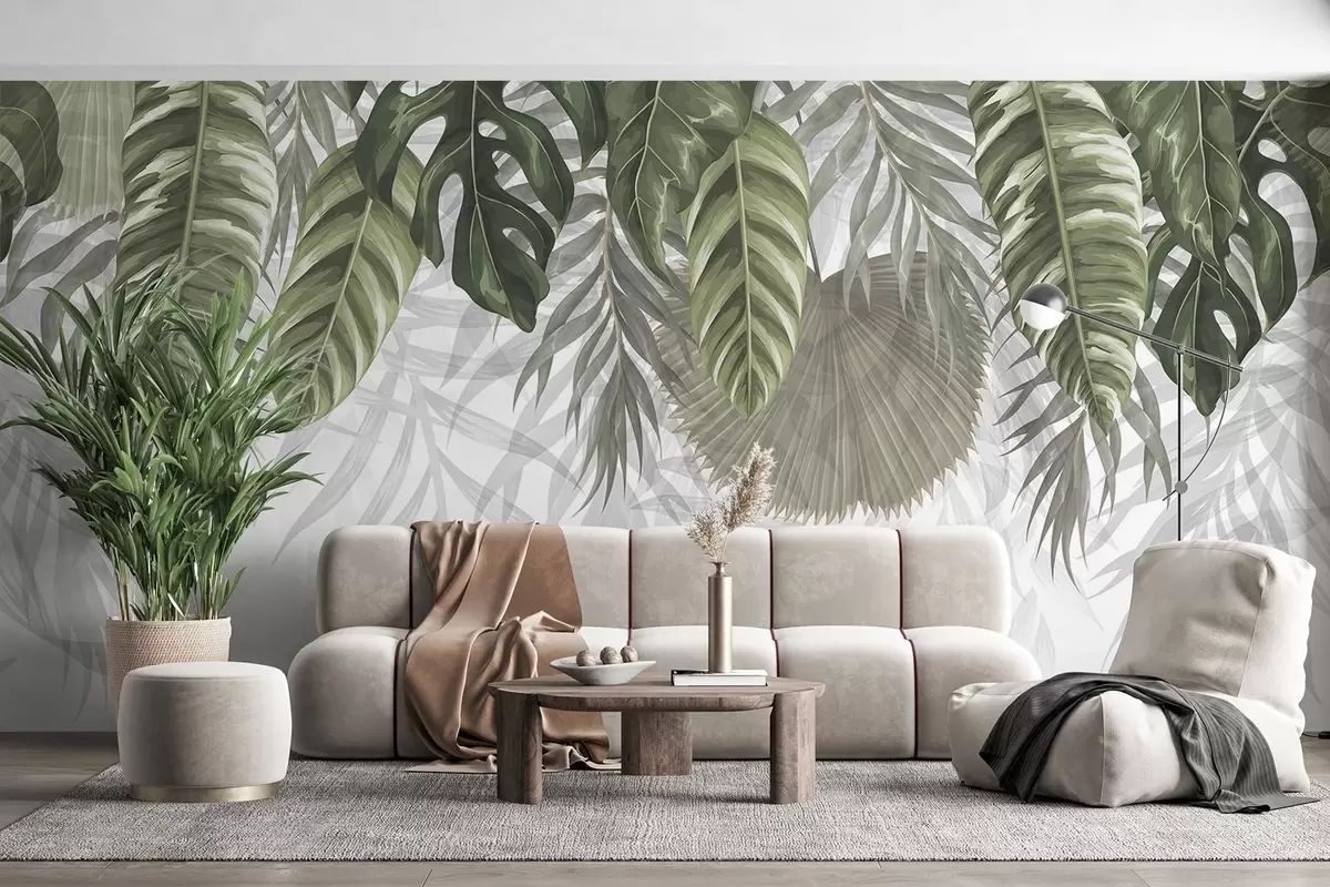 Papier peint Feuilles tropicales dans les tons de vert, y compris de grandes feuilles de monstera et des feuilles de palmier sur fond blanc N° w08443