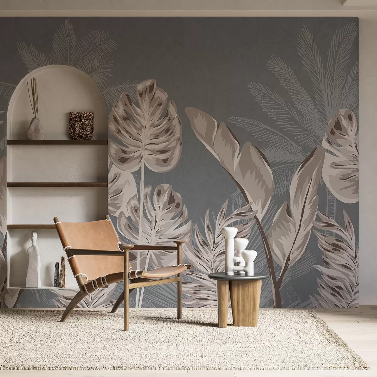 Papier peint De grandes et délicates feuilles beiges sur un fond gris mat, créant une atmosphère sereine et éthérée N° w08449