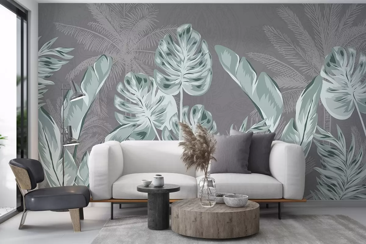 Papier peint Grandes feuilles délicates de couleur sarcelle sur un fond gris discret, créant une atmosphère sereine et éthérée N° w08449v1