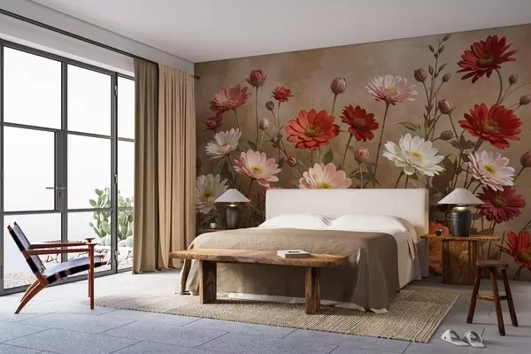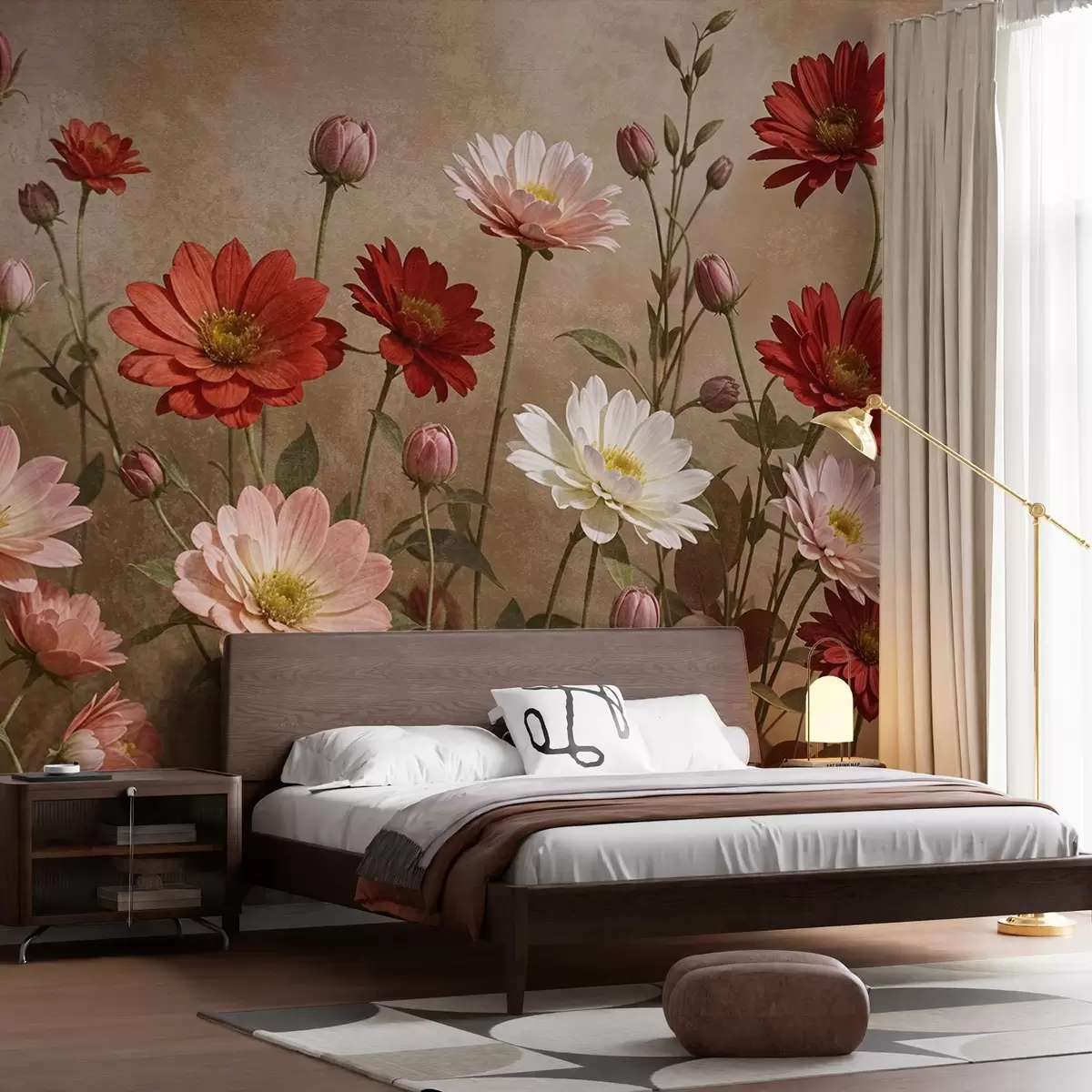 Papier peint Un champ de fleurs colorées ressemblant à des marguerites dans différentes nuances de rose, de rouge et de blanc sur un fond texturé N° w08462