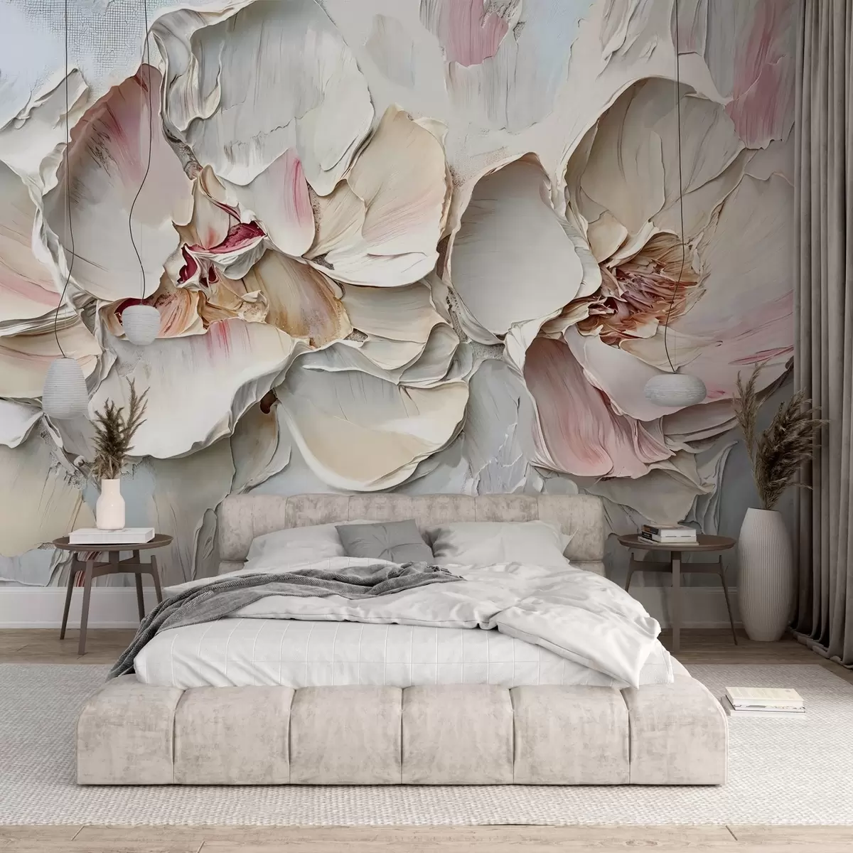 Papier peint Délicates fleurs rose pâle aux pétales doux et superposés sur un fond texturé et atténué imitation peinture à l'huile impasto N° w08467