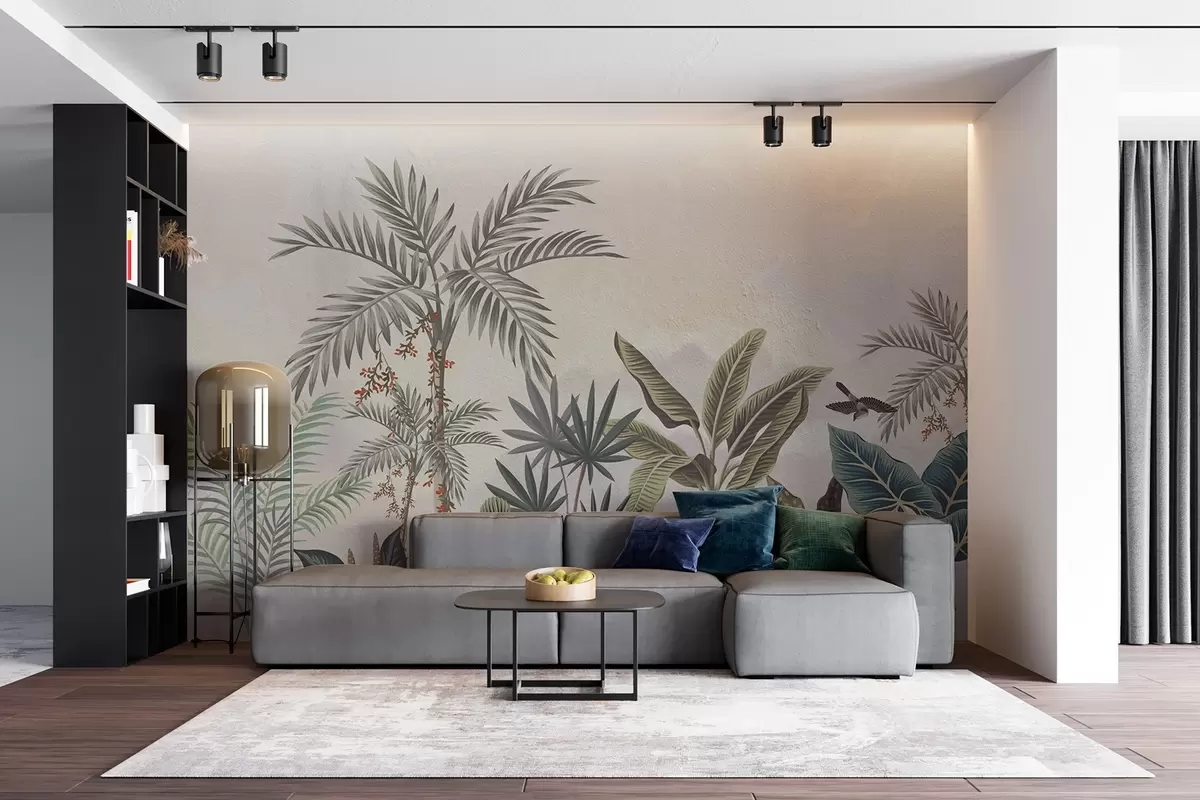 Papier peint Jungle tropicale avec palmiers et oiseaux colorés N° w08496