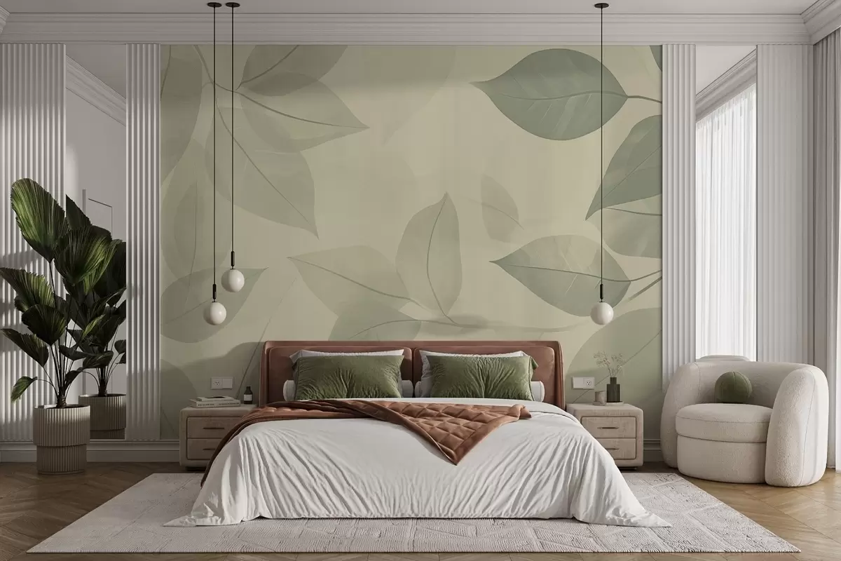 Papier peint Branches de feuilles vertes sur un fond beige doux N° w08502v2