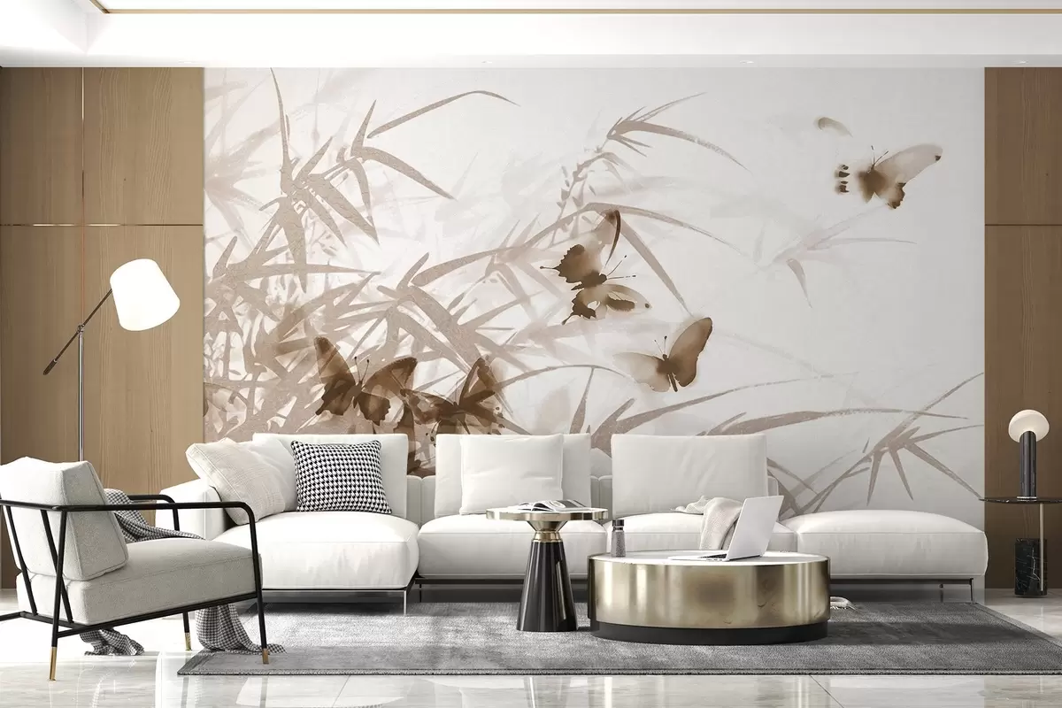 Papier peint Feuilles et tiges de bambou texturées avec des papillons bruns volants aux ailes transparentes N° w08524v1