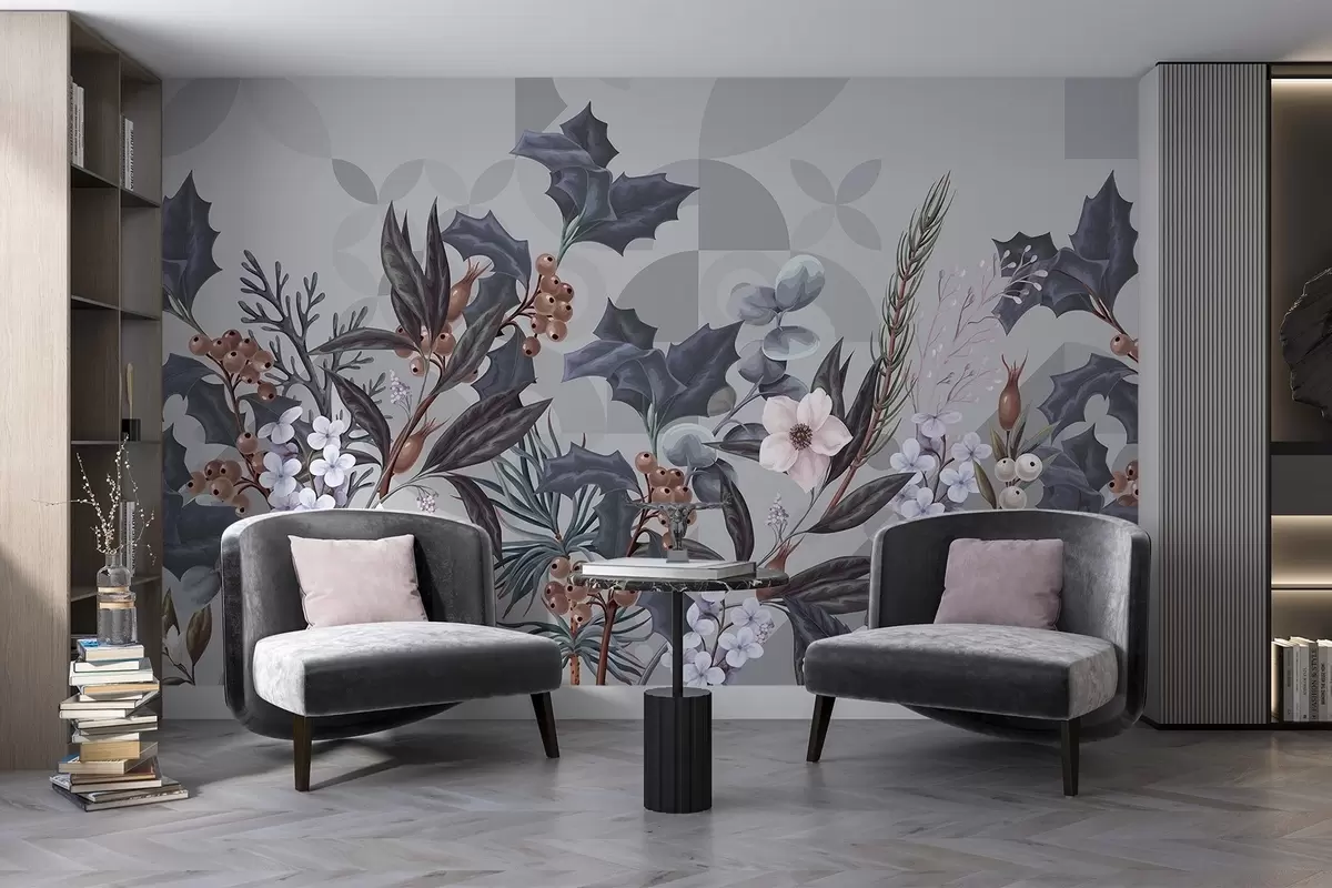 Papier peint Arrangement floral avec de grandes feuilles sombres, des fleurs et des baies sur un fond abstrait géométrique gris atténué N° w08525