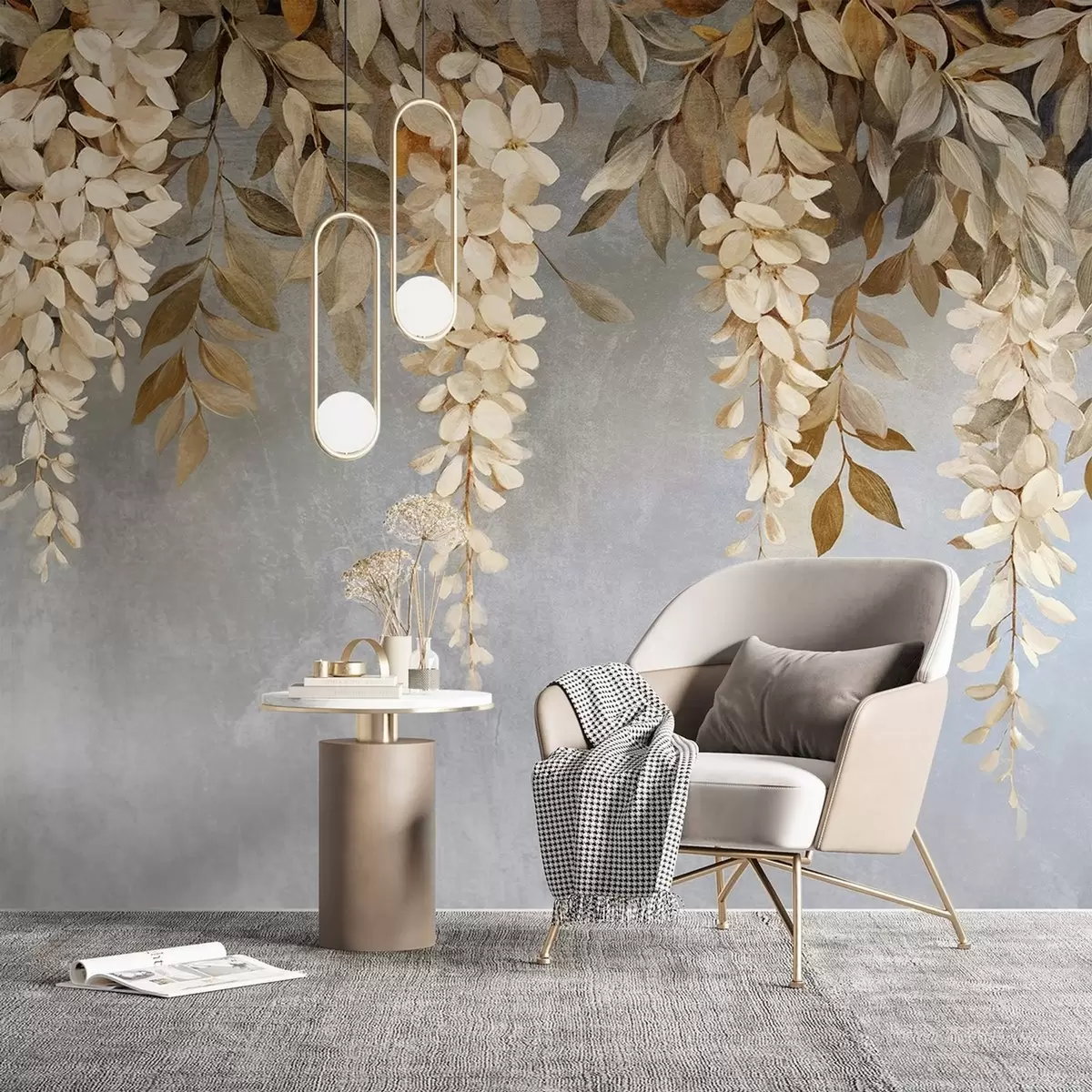 Papier peint Délicates fleurs de glycine blanches et beige clair avec leur feuillage tombant en cascade sur un fond gris doux N° w08531