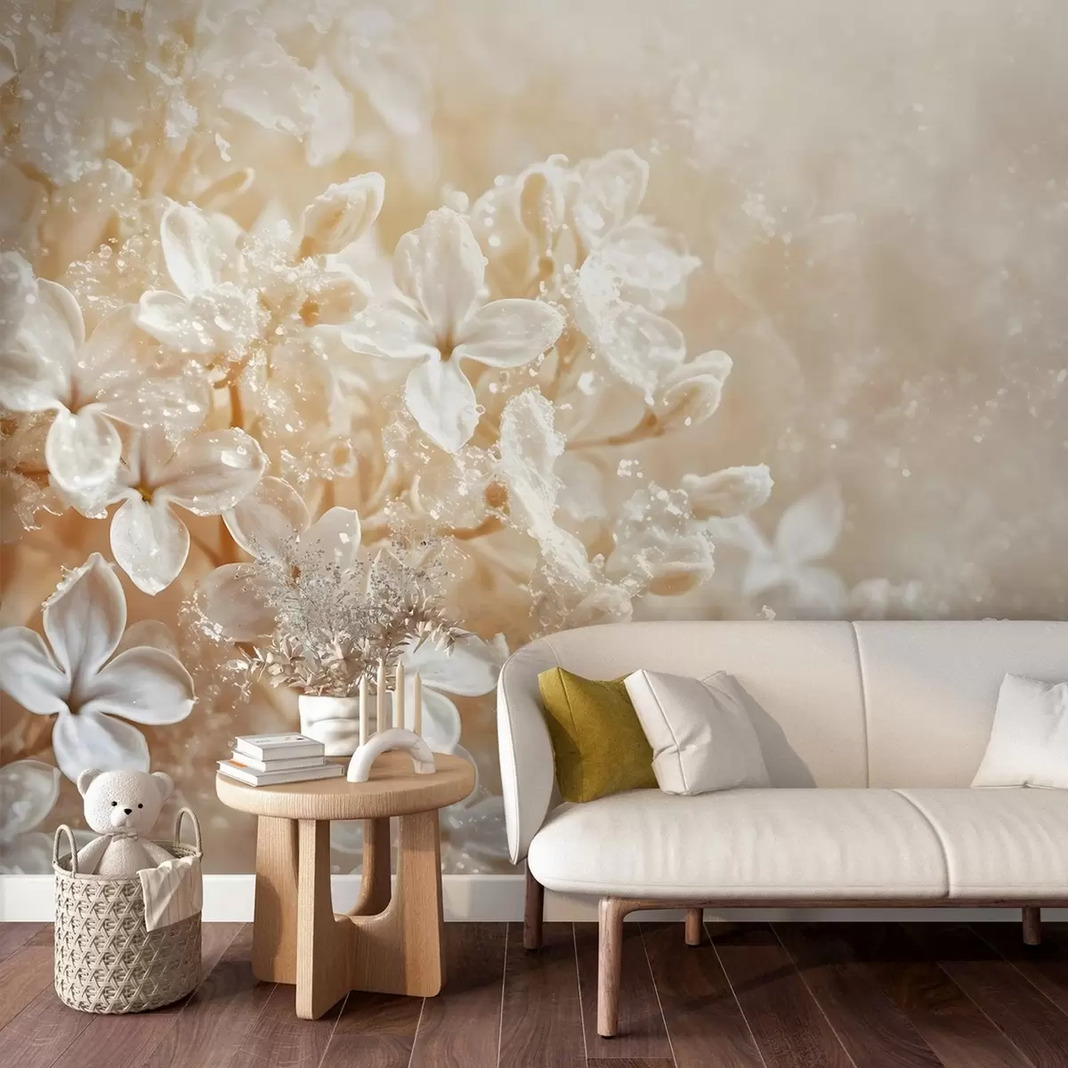 Papier peint Délicates fleurs blanches lilas sur fond flou jaune doux N° w08533