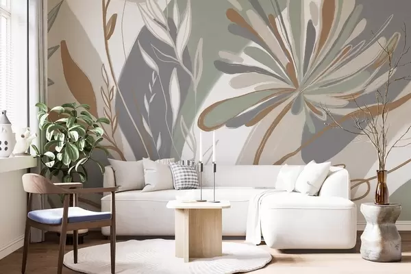 Papier peint Imprimé minimaliste floral abstrait avec des feuilles et des pétales stylisés dans les tons vert, gris et beige N° w08536