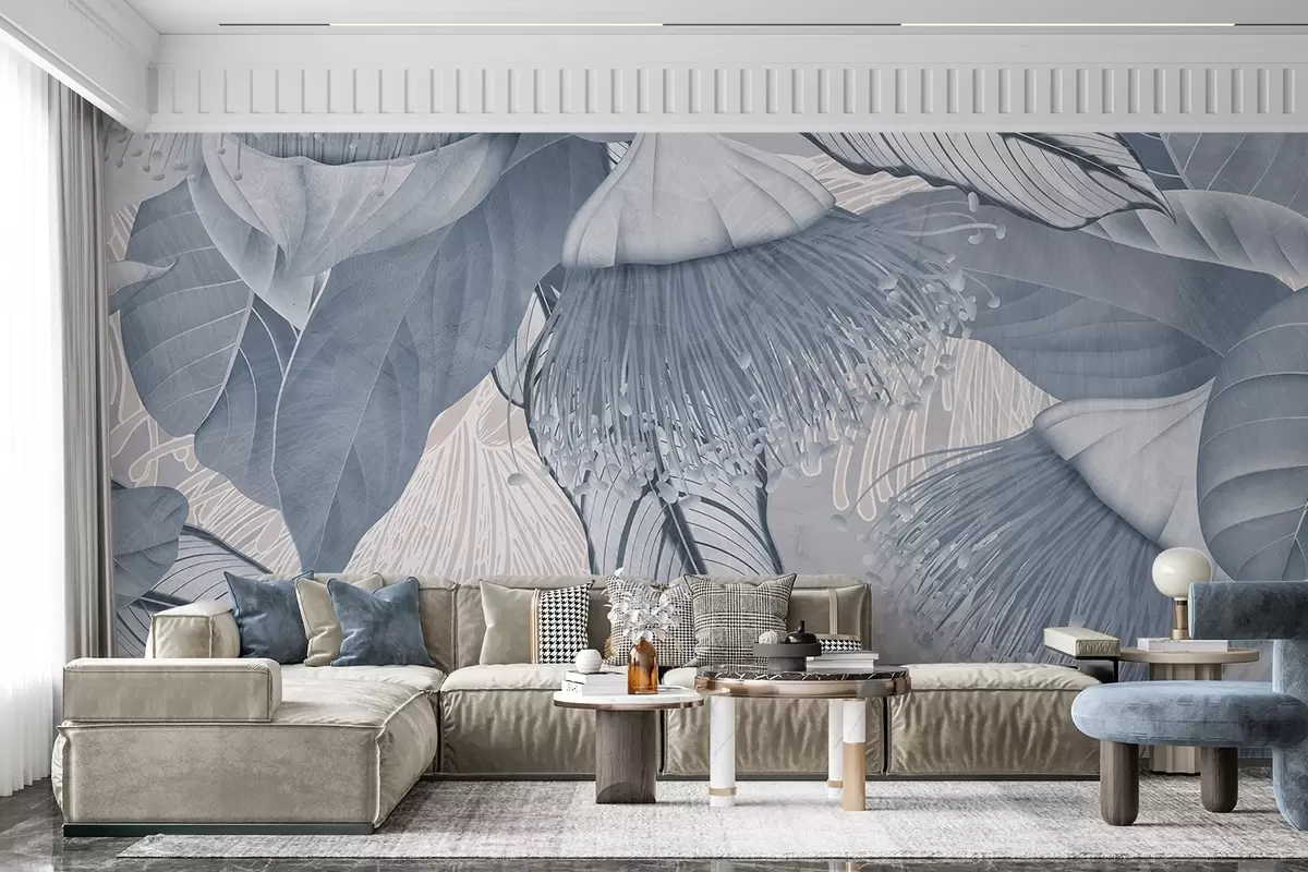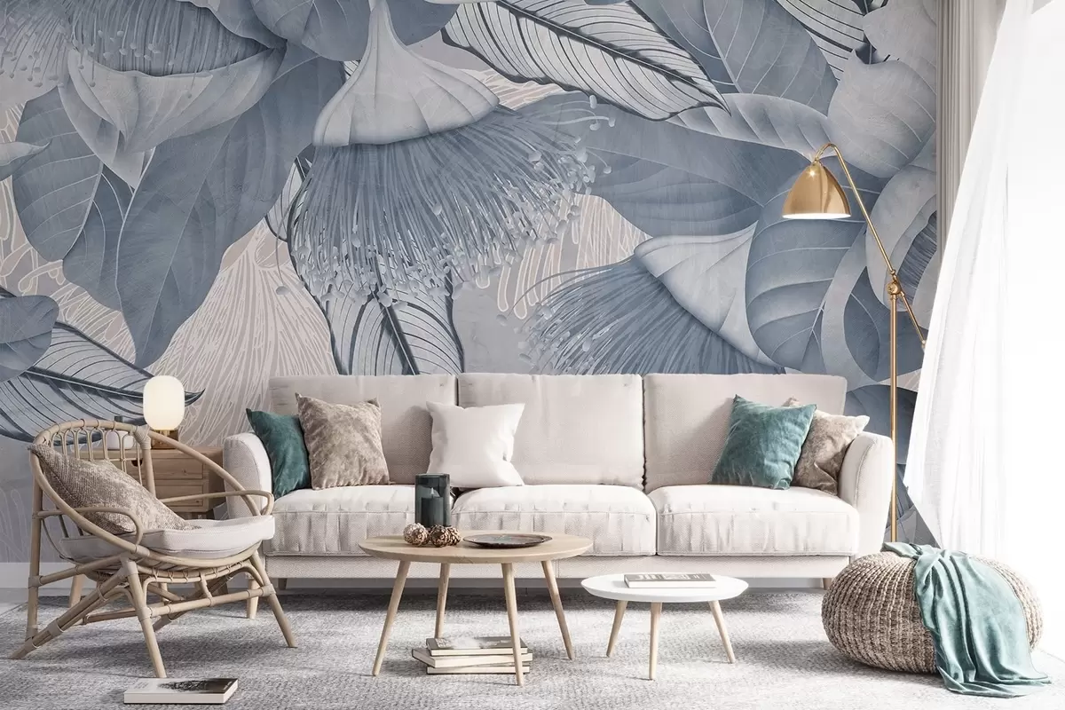 Papier peint Illustration botanique de grandes fleurs bleues d'eucaliptus avec de longues étamines sur un fond gris et blanc N° w08539v1