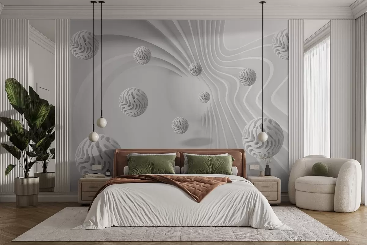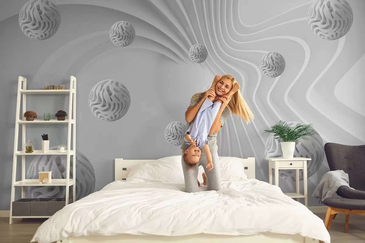 Papier peint abstraction grise en 3D avec sphères et effet de profondeur N° w08553