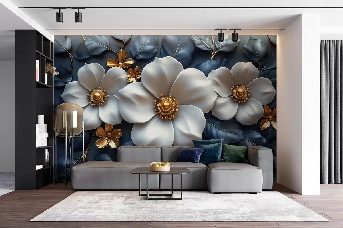 Papier peint Grandes fleurs blanches sur un élégant fond bleu avec des feuilles N° w08559