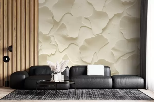 Papier peint Stuc avec embossage délicat de feuilles de ginkgo sur un fond beige doux N° w08560