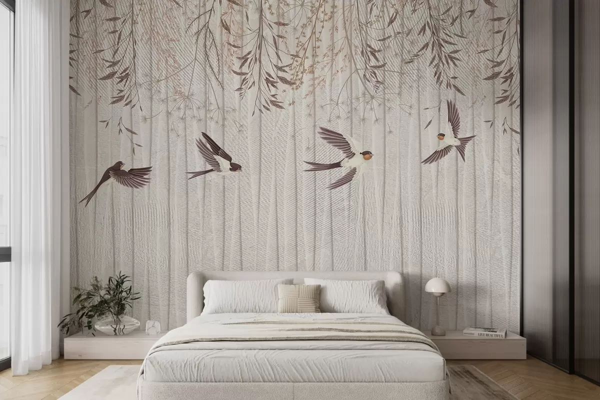 Papier peint Oiseaux en vol sur un fond texturé avec des pissenlits et des fleurs N° w08566