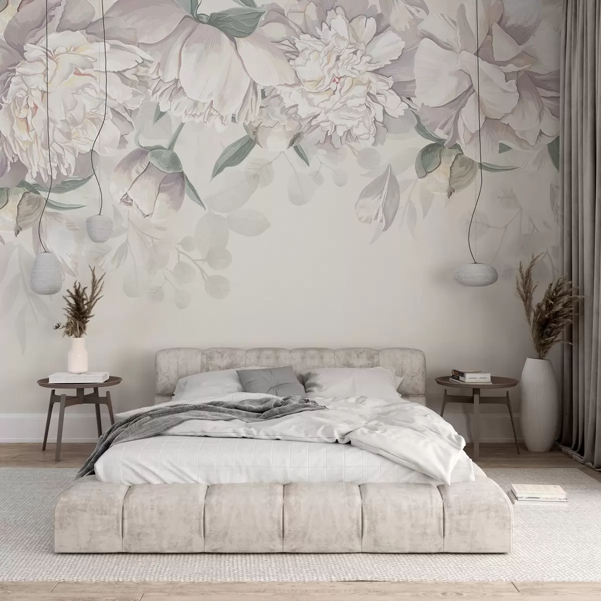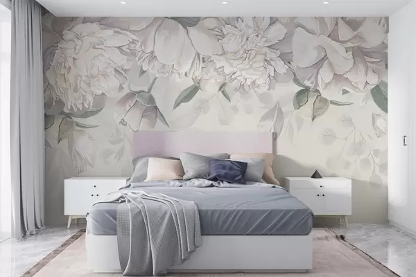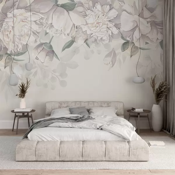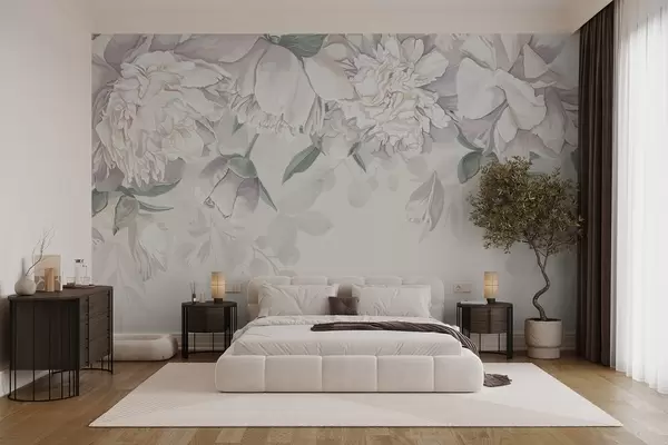Papier peint Délicates pivoines pastel blanches et roses avec des feuilles vertes, disposées sur un fond floral doux et romantique N° w08577