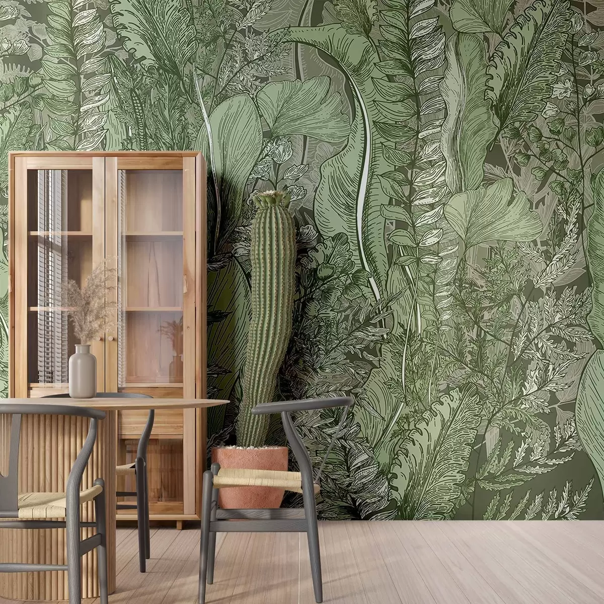 Papier peint Une forêt luxuriante et verdoyante avec différents types de fougères, de feuilles et de feuillages dans les tons verts N° w08579