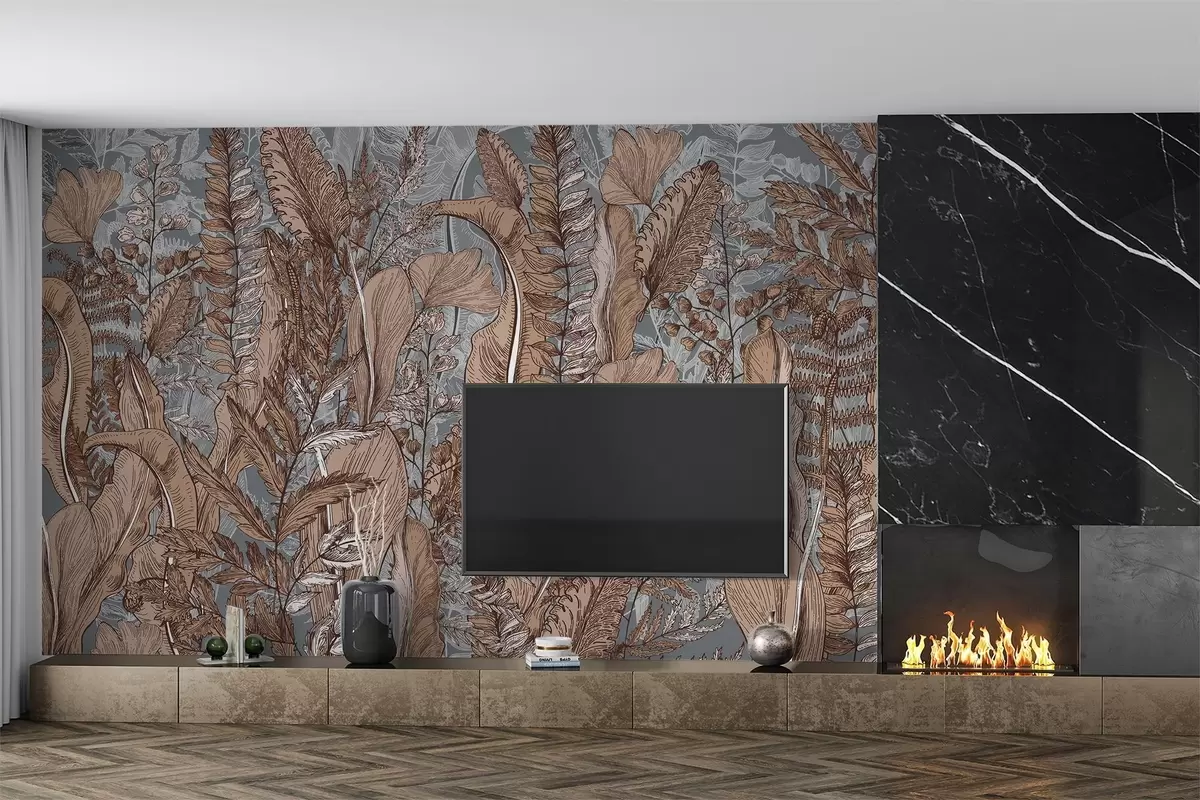 Papier peint Une forêt luxuriante et verdoyante avec différents types de fougères, de feuilles et de feuillages dans les tons bruns, bleus et gris N° w08579v1