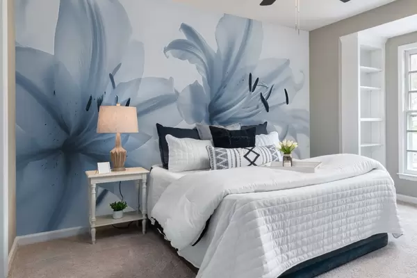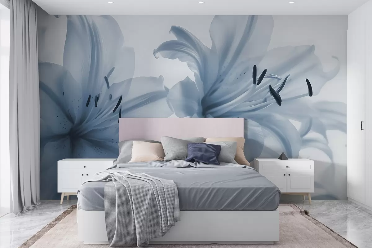 Papier peint Gros plan avec mise au point douce de fleurs de lys minimalistes bleues sur un fond clair N° w08586