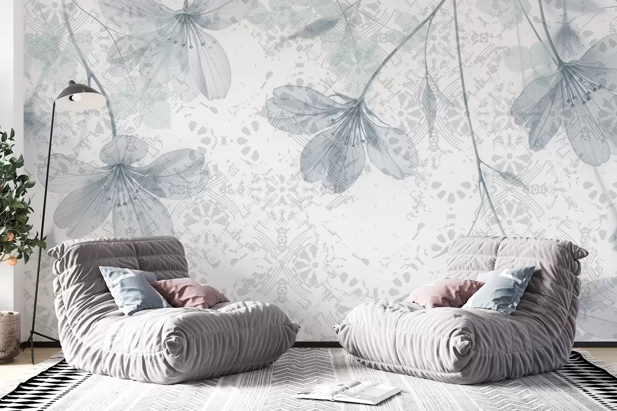 Papier peint Fleurs délicates bleues et blanches avec de longues tiges et des pétales sur un fond texturé doux et flou N° w08588