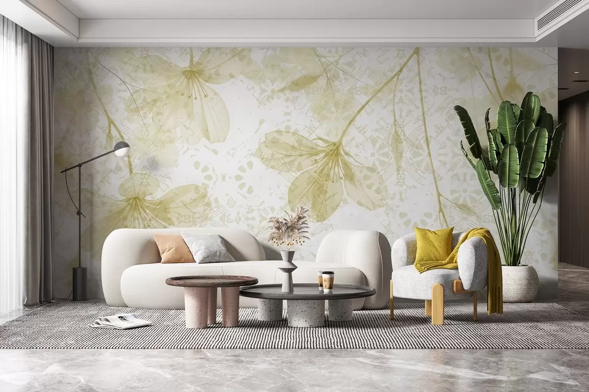 Papier peint Fleurs jaunes et blanches délicates avec de longues tiges et des pétales sur un fond texturé doux et flou N° w08588v2